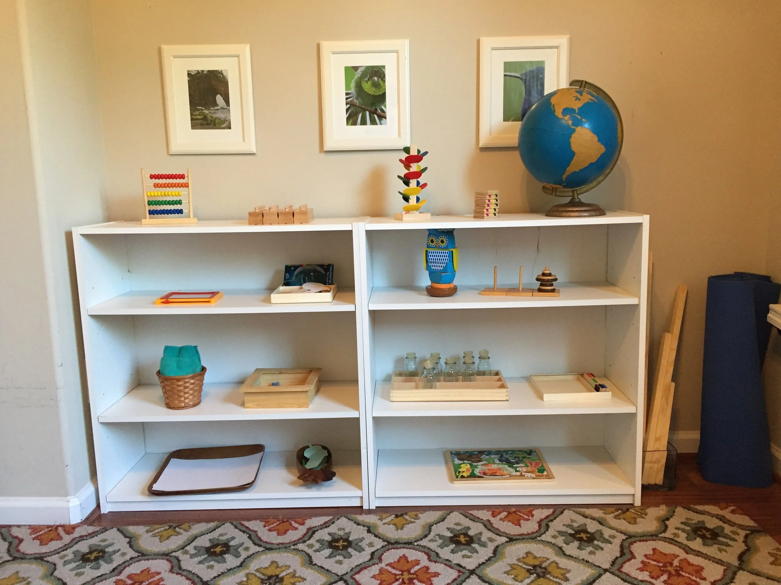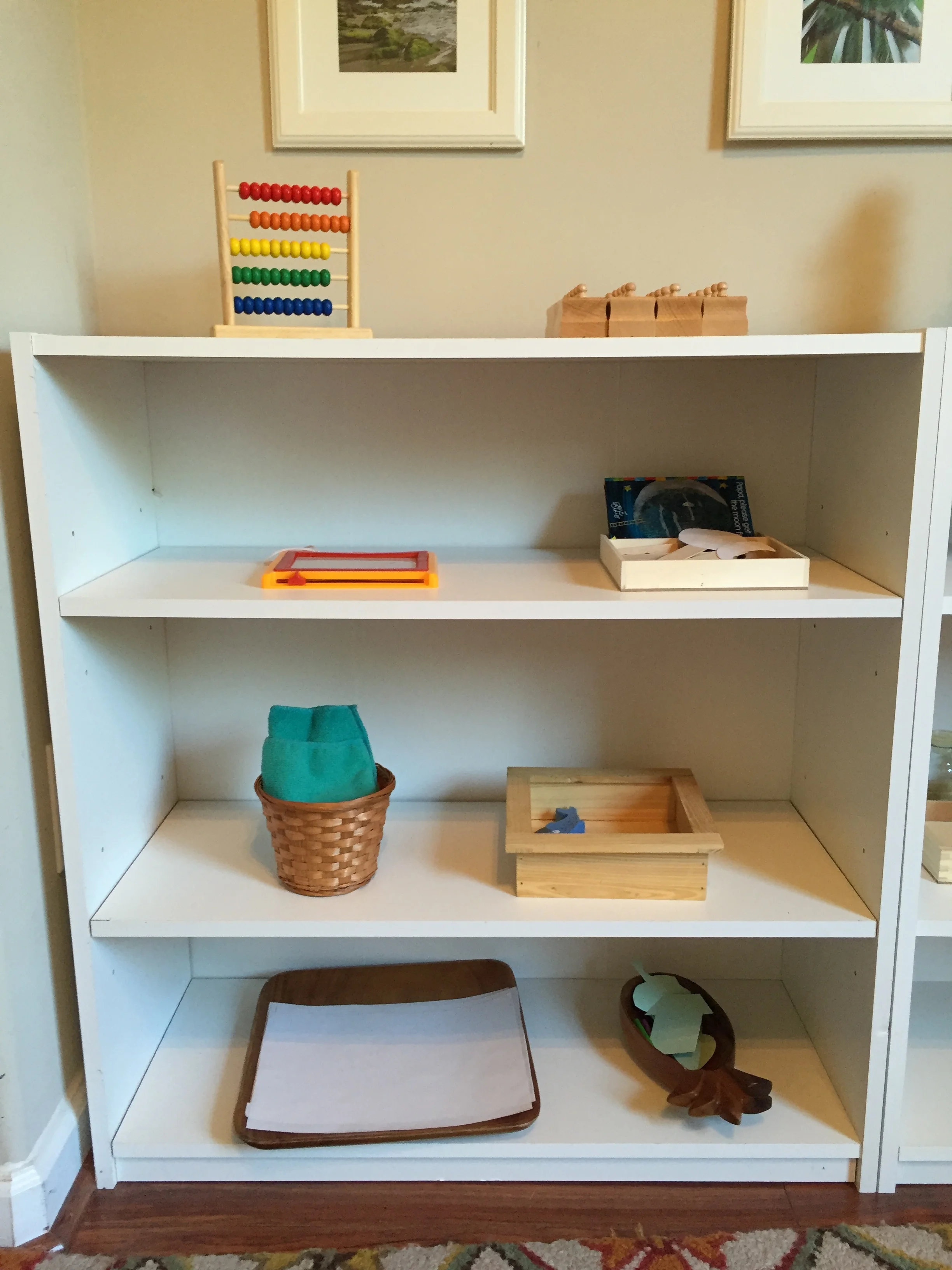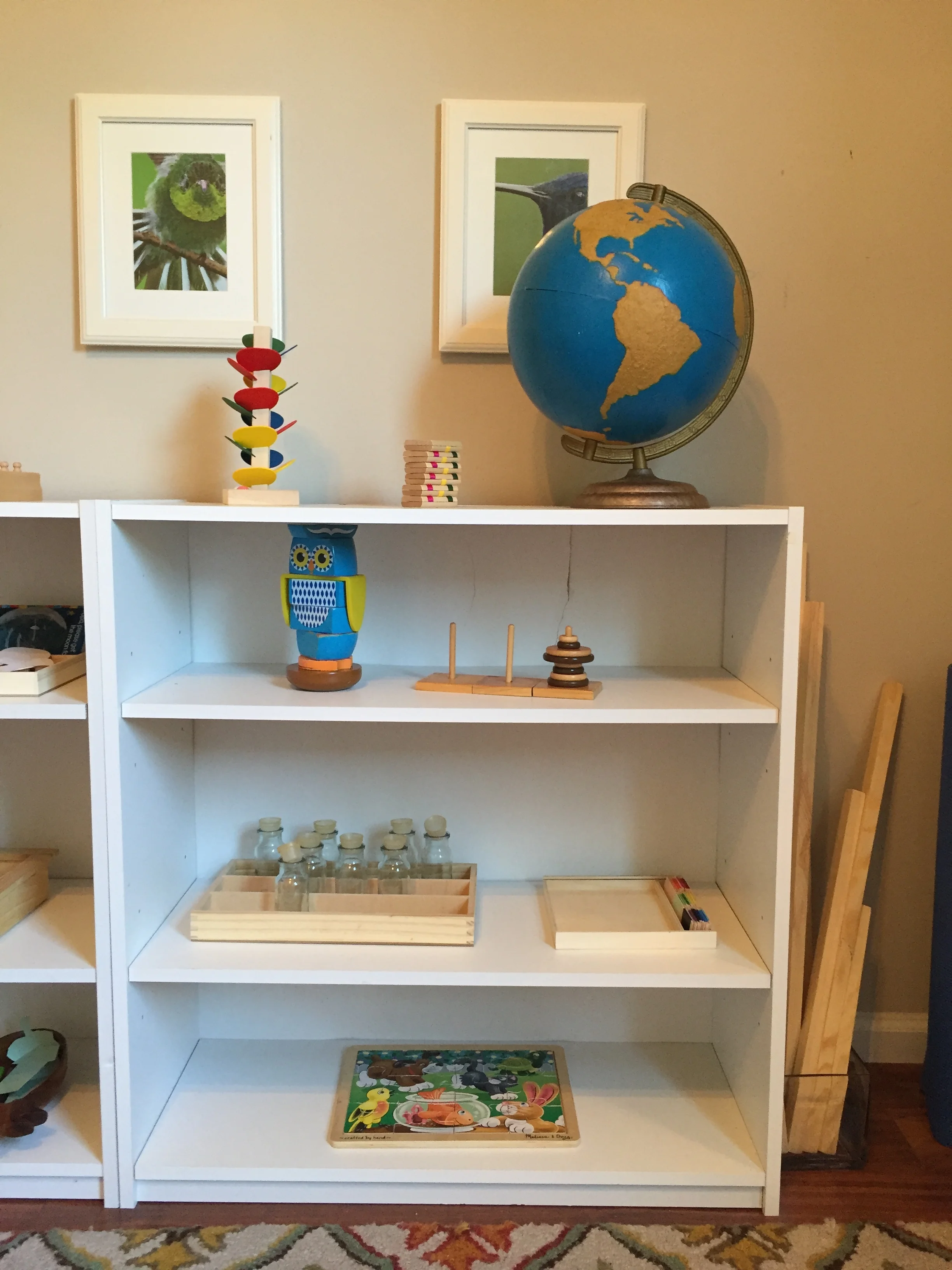 Here's the main set of shelves, for Alexander. I tried to simplify it since it felt overcrowded. I'm still learning as I go, but after exploring some blogs and the curriculum (Keys of the World) , I feel like I have a better grasp of what the Montessori classroom shelves should look like.