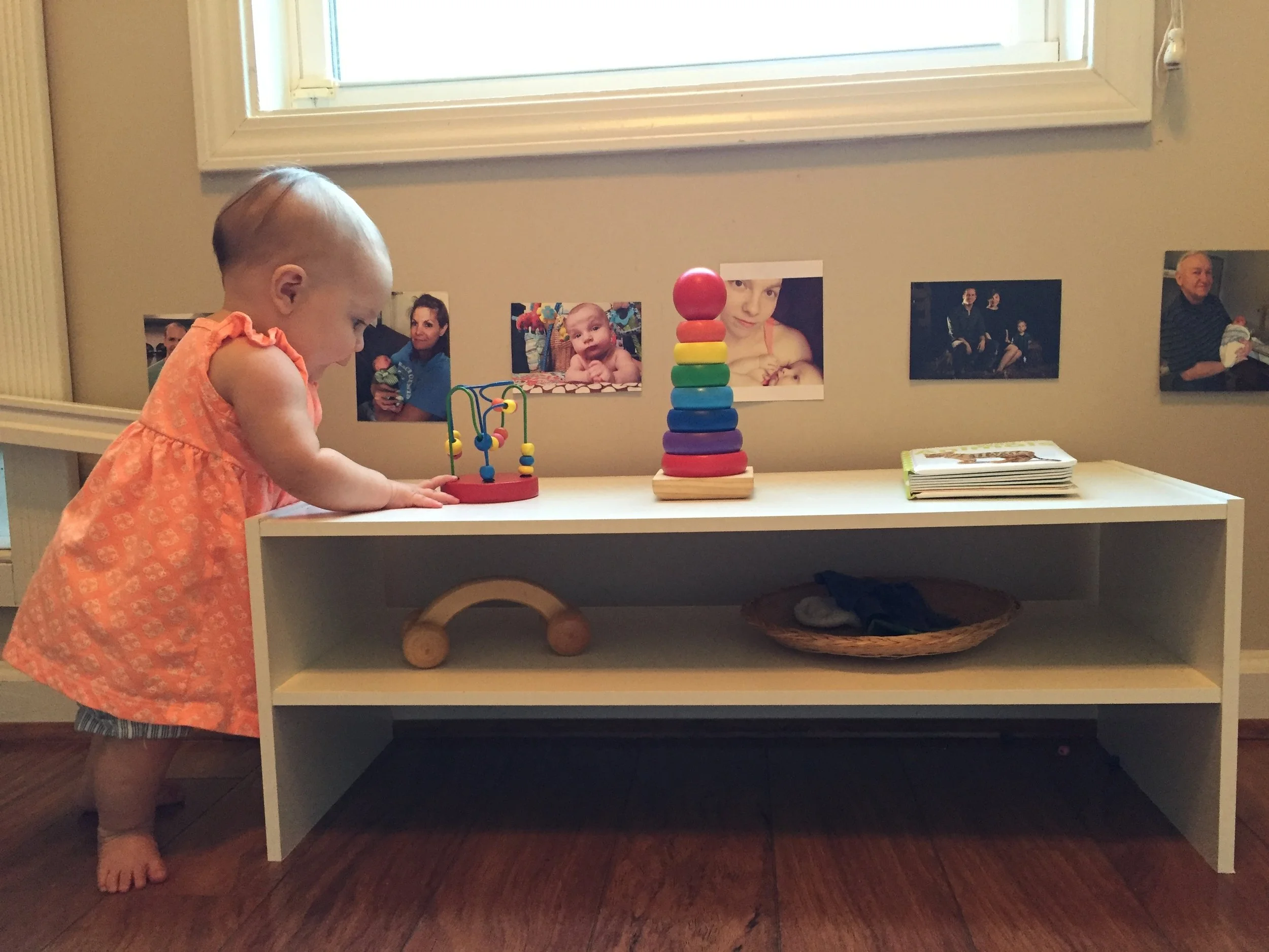 Finally, here is miss AB's little shelf. The top shelf has a ball maze, colorful tower (too many pieces, I know, but she isn't really able to stack anything yet anyway), and a textured book of animals.